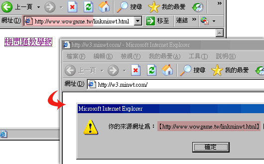 今天遇到一个蛮有趣的问题,由于公司与一些厂商有合作关係,因此双方的网站中也都会交换连结,当今天合约也终止后,但对方始终一直没把连结的部分下掉时,这有时会产生一些不必要的误会,让一般的使用者认为双方还有合作关係,固然说这样子可赚到一些流量,但相对的也造成了一些误解,因此上头则希望能否去判断使用从它站连来时,就把它拒绝在门外,这让梅干退了三步,原本以为要从主机来作设定,上网找了一些文件后,才发现只要用简单几行的javascript,就可抓到使用的来源,以及作出一些防范的措施。