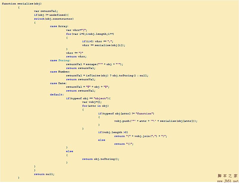 我们需要作的就是判断对象的具体类型,然后分别Serialize每种对象,再输出为Object的Literal语法形式就行了。准确的判断对象类型,使用我曾经说过的__typeof__方法就行了,序列化对象实例的代码如下: