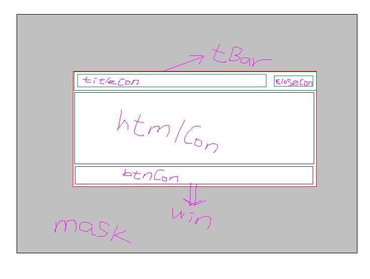 //弹出窗口,标题(html形式)、html、宽度、高度、是否为模式对话框(true,false)、按钮(关闭按钮为默认,格式为['按钮1',fun1,'按钮2',fun2]数组形式,前面为按钮值,后面为按钮onclick事件)