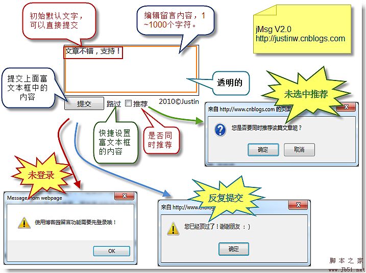 最后,新版快捷留言功能对上一版的使用者完全支持透明升级,也就是说原来使用上一版的用户,现在自己的博客里看到的应该已经是最新版本的界面和功能了!这里再重新说一遍jMsg的使用方法,跟以前完全一样: