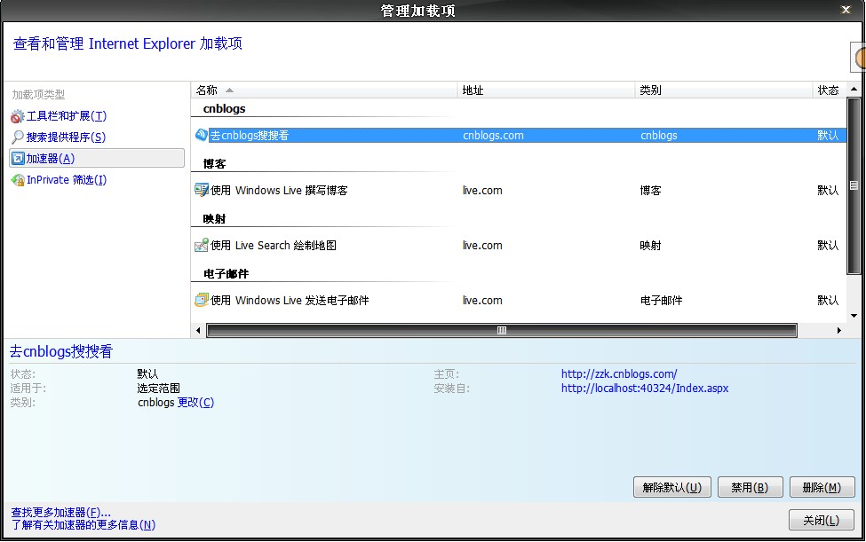 在IE8中右击-->所有加速器-->管理加速器即可以对现有的加速器进行管理,如下