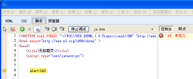 代码运行body标记的onload事件时调用了一个不存在的函数NonExist(),产生了错误,如下图: