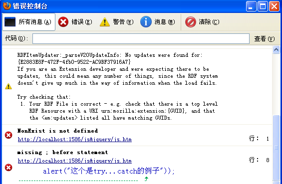 try语句里面出现了括号不匹配的错误,而整个代码并没有运行catch中的模块,而是浏览器弹出了错误提示框,如下图: