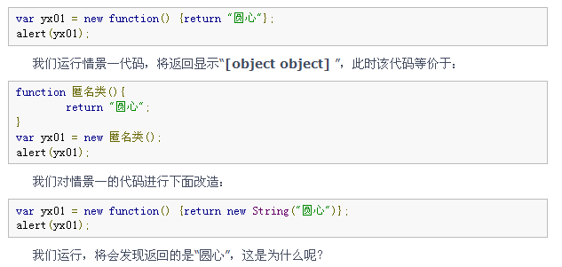 JS中只有函数对象(函数)具备类的概念,因此创建一个对象,必须使用函数对象。函数对象内部有[[Construct]]方法和[[Call]]方法,[[Construct]]用于构造对象,[[Call]]用于函数调用,只有使用new操作符时才触发[[Construct]]逻辑。注:在本例中HumanCloning这个自定义函数是一个函数对象,那么请问Object,String,Number等本地对象是函数对象吗?答案是肯定的,这是因为本地对象都可以看作是函数的派生类型,在这个意义上,可以将它们跟用户定义的函数等同看待。(与《理解Javascript_04_数据模型》中"内置数据类型"一节相呼应)