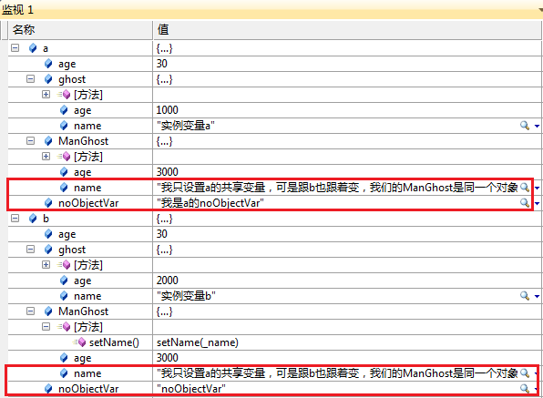 使用.prototype.定义的成员,如果该成员对象变量,则每个对象实例都共享同一个对象副本。(例如:Man.prototype.ManGhost)