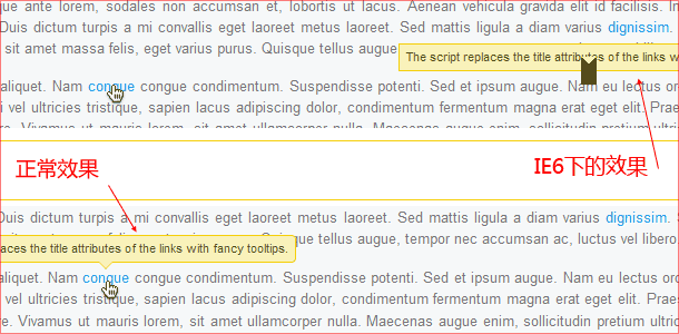 今天又回顾了一下这个插件,然后发现它在IE6下面工作的时候,显示起来是不正常的,tip经常出现在很离谱的位置。问题还有,由于tip的显示效果没有用到任何图像,都是纯的CSS,所以里面用CSS实现的三角形在IE6下是无法工作的,会显示一块有色区域,很丑,所以我就想动手改它一下。先上一张对比图好了: