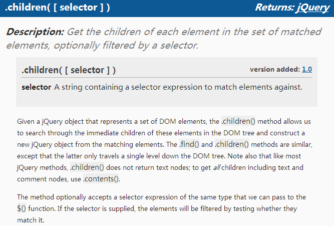 4:children方法的参数selector 是可选的(optionally),用来过滤子元素,但find方法的参数selector方法是必选的。