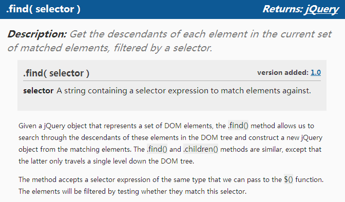3:find方法获得所有下级元素,即:descendants of these elements in the DOM tree