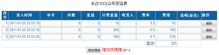 难点在动态添加整行表格数据,而且每行数据上的各文本框对象的事件也要实现自动统计和运算,有相当的难度。如果使用JavaScript需要调用Dom对象创建一个<tr>单元格,还需要在tr里面添加10多个单元格<td>对象,每个单元格<td>对象内要添加文本框对象,还需要在文本框对象上响应onblur事件进行运费计算,代码量相当大。