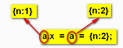 a.x 中的a指向的是 {n:1},a 指向的是 {n:2}。如下图