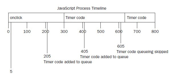 比如onclick要300ms执行完, block1代码执行完, 在5ms时执行setInterval, 以此为一个时间点, 在205ms时插入process代码, click代码顺利结束, process代码开始执行(相当于图中的timer code), 然而process代码也执行了一个比较长的时间, 超过了接下来一个插入时间点405ms, 这样代码队列后又插入了一份process代码, process继续执行着, 而且超过了605ms这个插入时间点, 下面问题来, 可能你还会认为代码队列后面又会继续插入一份process代码...真实的情况是,由于代码队列中已经有了一份未执行的process代码, 所以605ms这个插入时间点将会被"无情"的跳过, 因为js引擎只允许有一份未执行的process代码, 说到这里不知道您是不是会豁然开朗呢...