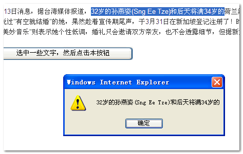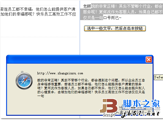 例如在IE7浏览器下,选中一段文字再点击demo页面上的测试按钮,就会有类似下面的弹出内容: