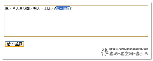 差不多去年这个时候,自己折腾过JS 文本域光标处添加文字并选中的内容,也是拿的新浪微博示例的,文章是“新浪微博插入话题后部分文字选中的js实现”,但是去年这篇文章多实现的话题插入效果是比较弱的: