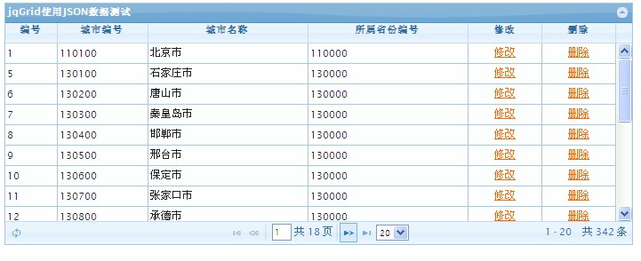 我这里用的不是jqGrid的自带的编辑和删除操作,我已经把分页导航栏下的编辑,删除,搜索都取消掉了,就是这句$("#list1").navGrid("#pager1",{edit:false,del:false, search:false}), 然后在数据加载完成后,给每行添加了 修改和删除链接
