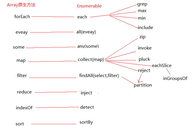 看上面的图示明显可以看得出,each和map 的重要性,map其实本质还是each,只不过each是依次处理集合的每一项,map是在each的基础上,还把处理后的结果返回来。在Enumerable内部,map是collect方法的一个别名,另一个别名是select,其内部全部使用的是collect这个名字。