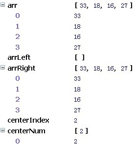 这是第一次执行函数的变量情况:中间数是40;根据循环里的判断条件小于40的存放在arrLeft,大于40的存放在arrRight里面。如下图