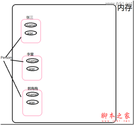 内存中就这样了,每个对象,都有自己的 name, age 内存.这里new了多少个对象,就要开辟多少块name, age内存.