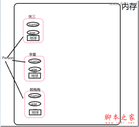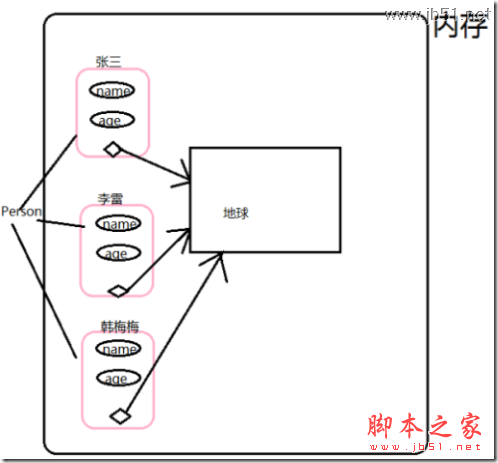 这里我们看,三个对象都有一个"地球"的内存空间. 这里你要动动大脑了, 三个人都有地球的内存,我们是不是可以这样呢?