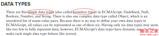 但ECMAScript中没有所谓的primitive types,就好比它没有类(class)的概念一样(具有其它语言能力的人仍然喜欢在JavaScript使用名词“类”)。它里面提到的就是类型,可以把它理解成基本类型,但也应该是6种。这里的基本类型也不是Java中的基本类型,因为它包含了复杂数据类型-对象。