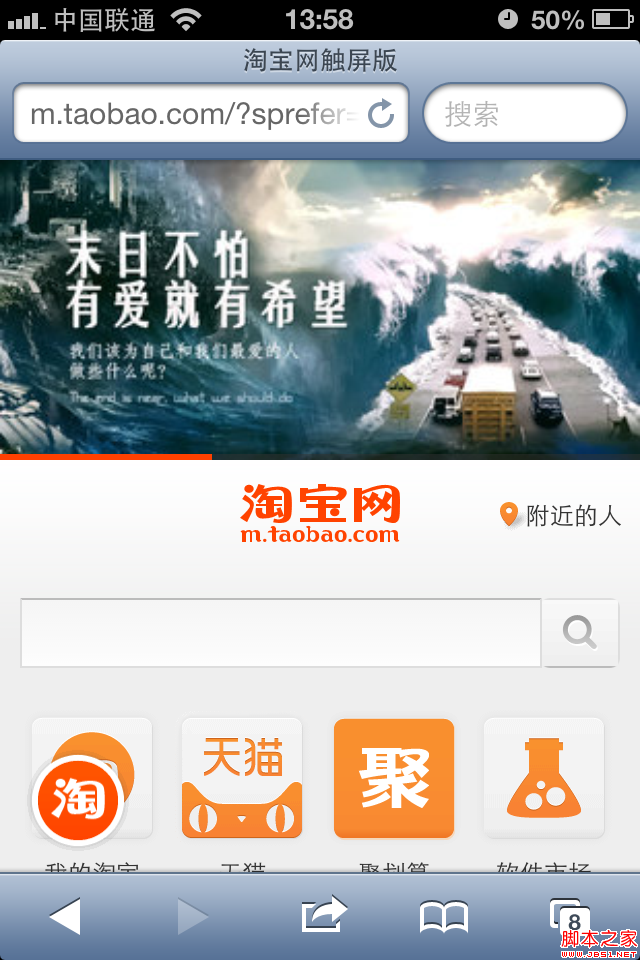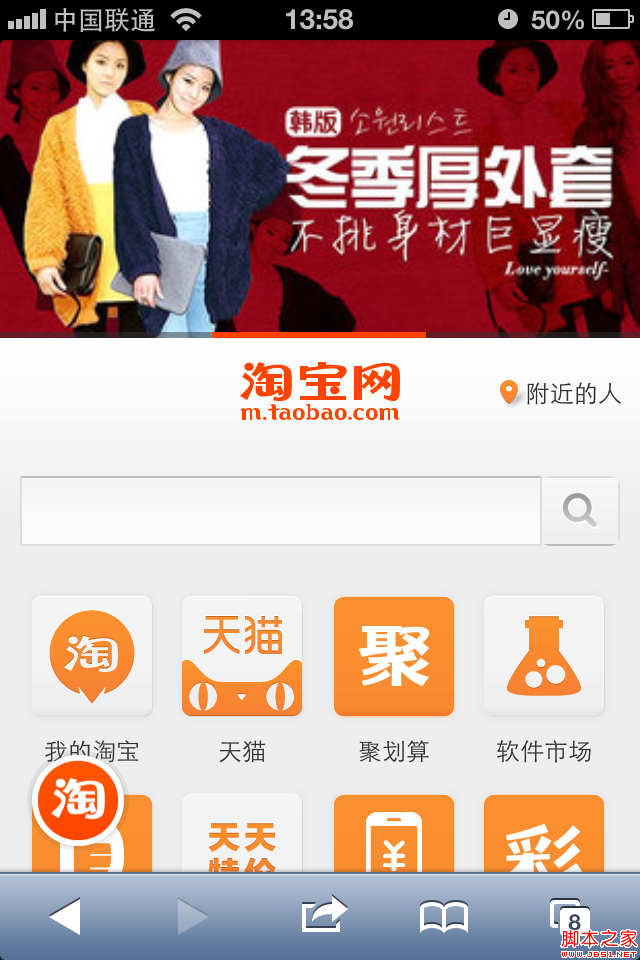 大家通过手机自带浏览器打开百度、淘宝,在首页加载完毕后,会自动隐藏页面上方的地址栏,加之这些网站针对手机浏览器做了优化,乍看之下,还真难区分这是WEB APP还是Native App,如下左侧图片为通过safari打开淘宝网的首页,要不是因为底下的浏览器工具栏,还真像Native App。实际上它是有地址的,向下拖动就会看到地址栏,如下右侧图片。