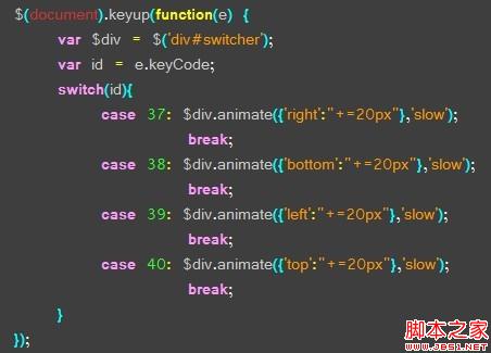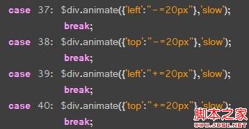 题目:按下方向键时,使层向相应的方向平滑移动20像素;四个方向键的键码分别是37(左)、38(上)、39(右)和40(下)。