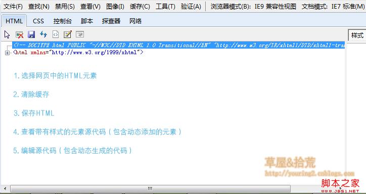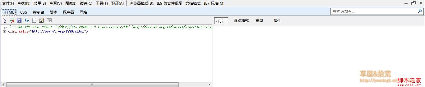 我们看到在这个工具窗口里面有几个标签页,分别是:HTML、CSS、控制台、脚本、探查器和网络,点开每一个标签,可以执行相应的任务。