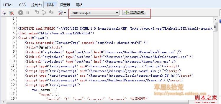 点击Scripts按钮,可以打开这个调试窗口,里面包含了网页中脚本文件源码,点击左侧的按钮可以打开选择文件的侧窗口。右侧有调试的工具按钮,不过我不喜欢这些纯英文的界面,所以大部分的调试都还是在IE下进行。并且会在IE下转到VS中。