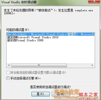 这种方法很简单,我们只需要在进行调试的地方加入debugger关键字,然后当浏览器运行到这个关键字的时候,就会提示是否打开调试,我们选择是就可以了。这种调试可以选择调试工具,是新打开vs还是在现有的VS中调试,都可以选择,个人比较喜欢这中调试方式。