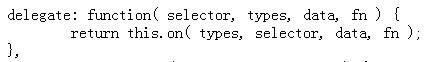 最后有一点,原先的live()方法,处理函数是默认绑定在document对象上不能变的,如果DOM嵌套结构很深,事件冒泡通过大量祖先元素会导致较大的性能损失。而使用.on()方法,事件只会绑定到$()函数的选择符表达式匹配的元素上(上面我的例子中,为了简单绑定到了document),因此可以精确地定位到页面中的一部分,而事件冒泡的开销也可以减少。delegate()与on()同理,毕竟是用on()实现的: