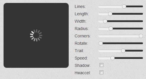 Spin.js可以自定义动画加载图案的长度、宽度、粗细、速度等参数,非常灵活。 利用Spin.js可以快速地为你定制一款漂亮的加载动画图片。