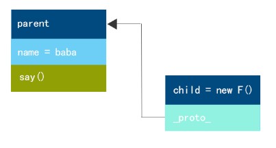 其中F()为一个临时的空的构造函数,然后将F()的原型设置为父对象,但是同时它又通过受益于_proto_链接而具有其父亲对象的全部功能。