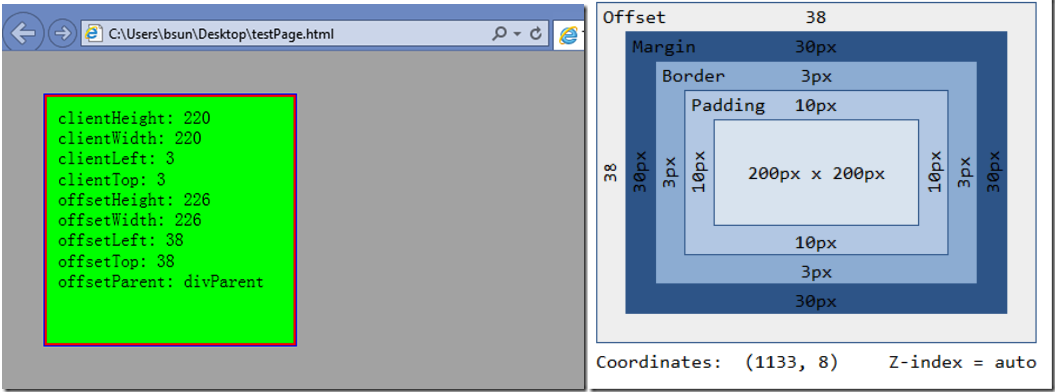 由上面计算坐标方法,我们可以方便得出元素尺寸。在符合W3C标准的浏览器中getBoundingClientRect返回的对象还包括width和height,但在原始IE中未实现,但是通过返回对象的right-left和bottom-top可以方便计算出。