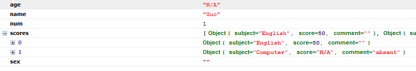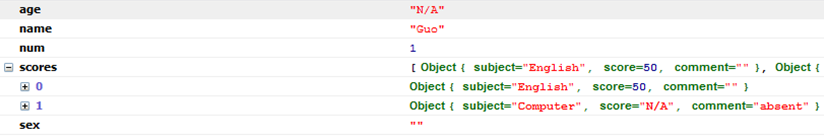 一个json object,并且可能包含一些空值或者空字符串,在页面显示的时候希望遇到空值显示“N/A”,但是有一部分值是允许空值的。因此希望通过筛选将空值设为“N/A”.例如希望学生的“age”和“score”如果为空显示“N/A”,而“sex”或者“comment”为空则不做处理。