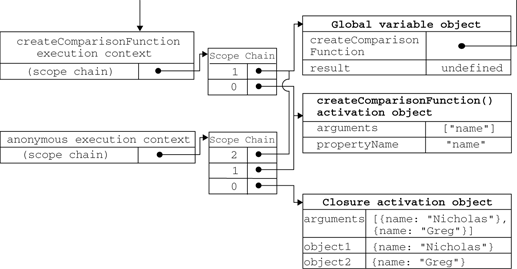 引用一张《Javascript高级程序设计》中的图来说明,虽然这张图并不完全说明所有情况。图中的activation object就是用于保存变量的对象。