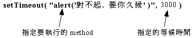 setTimeout( )是设定一个指定等候时间 (单位是千分之一秒, millisecond), 时间到了, 浏览器就会执行一个指定的 method 或 function, 有以下语法: