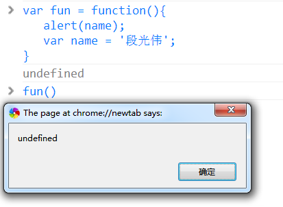 当执行这个函数时候时(fun()),函数体还没执行到,当前的活动对象为[{ name: undefined }],因此fun()执行的结果为:
