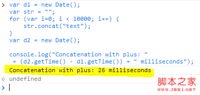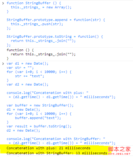 基于上面的实现我们来进行一下运行时间对比,即以“+”逐个进行字符串连接和我们封装的工具。可用下面的代码测试 StringBuffer 对象和传统的字符串连接方法的性能,在chrome控制台输入一下代码并运行: