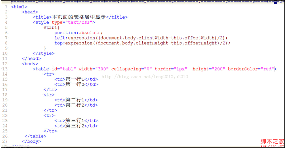将div设置为居中显示,今天来分享一下如何将表格居中的显示。至于居中的原理就不说了,可以看一下我的上篇博客,这次没有使用window的两个事件,而是使用一个叫expression的函数。现在多数的浏览器都支持这个函数。在写上一篇博客的时候,我脑里想能不能把计算后的值赋给css的left和top属性呢?后来查阅资料找到了这个函数。这个函数用来把CSS属性和JavaScript表达式关联起来,这里的CSS属性可以是元素固有的属性,也可以是自定义的属性。就是说CSS属性后面可以是一段JavaScript表达式,CSS属性的值等于JavaScript的结果。在表达式中可以直接引用元素自身的属性和方法,也可以使用其他浏览器对象。这个表达式就好像是在这个元素的一个成员函数中一样。