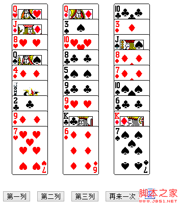 让我猜猜你心中的牌,先随机生成27张牌,不能重复列出三列牌,然后记住其中一张,然后点击牌所在的列,多次就可以猜出你想的牌。