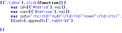 我先通过变量获取值,接着建了一个html标签,然后appendTo到table里,这样,大家就可以看到数据的插入了,当然,这不是数据库。。。大家记得,借助于juqery ui,一个dialog,我们就能实现拖动式弹窗了。。。