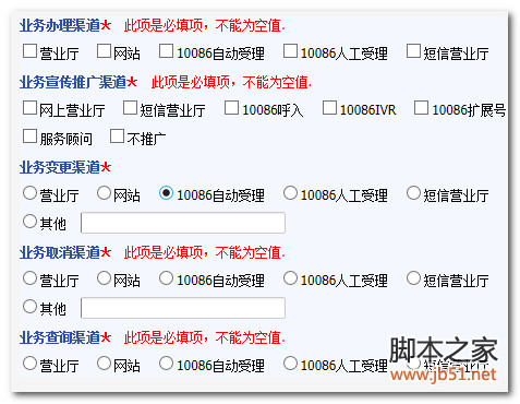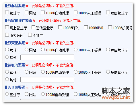 看到上面网页没?业务办理渠道下的多选必须要选中一个,怎么办?如果一个都没有选中,在表单提交的时候我们就要去提示错误信息,,,。大家都知道jquery验证input是非常简单的,却很少要去验证多选或单选,而且还是一组组的验证,是分了组的,并非页面上的所有!!怎么办呢?