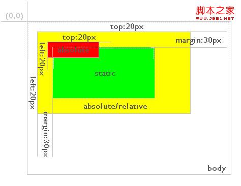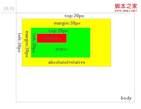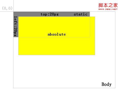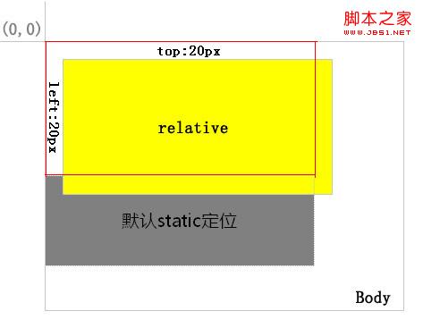 可以看到,红色背景层依然定义top:20px;left:20px;但其相对的元素变为定位方式为absolute或relative的黄色背景层。因此,对于absolute定位的层总是相对于其最近的定义为absolute或relative的父层,而这个父层并不一定是其直接父层。如果其父层中都未定义absolute或relative,则其将相对body进行定位,如图5: