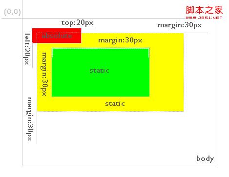 图中,红色背景层为relative定位,其直接父元素绿色背景层为默认的static定位。红色背景层的位置为相对绿色背景层top、left个20元素。而如果红色背景层定位为absolute,则情形如图4: