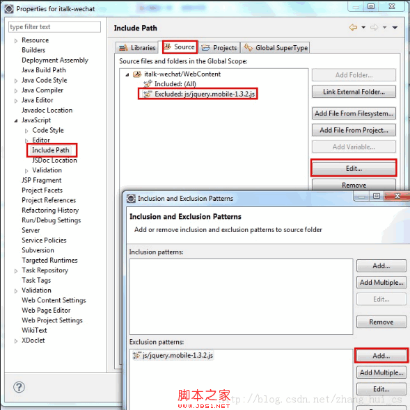 Project Properties > JavaScript > Include Path > Source > 选中Exclude > 点击edit按钮 > 在下面的 Exclusion patterns 中添加对应的文件。