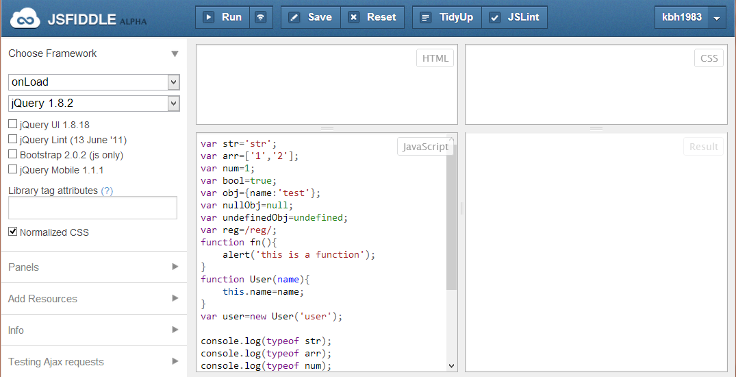 在这里我首先像大家推荐一个很好用的在线编辑器:http://jsfiddle.net/。他提供了jquery、mootools、prototype和YUI三个主流js框架的各个版本,当你需要编写简单的js测试程序的时候可以直接使用它。省去了打开编辑软件,创建各种类型文件的步骤。编辑代码之后,点击[Run]按钮,一切搞定。