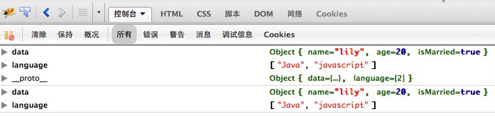 注意这里的parent的两个属性data,language都是引用类型,一个是对象,一个是数组。child仍然继承与parent,随后修改了child,结果如下