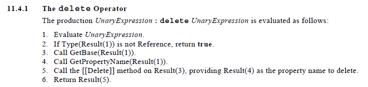 ES3 中,delete在8.6.2.5及11.4.1有介绍,如下