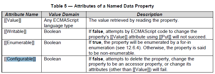如果该值为false,则不能delete,以上列举的9点在ES5中描述为[[Configurable]]为false。