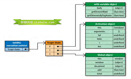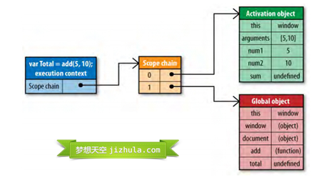 这些值按照它们出现在函数中的顺序被复制到运行期上下文的作用域链中。它们共同组成了一个新的对象,叫“活动对象(activation object)”,该对象包含了函数的所有局部变量、命名参数、参数集合以及this,然后此对象会被推入作用域链的前端,当运行期上下文被销毁,活动对象也随之销毁。新的作用域链如下图所示: