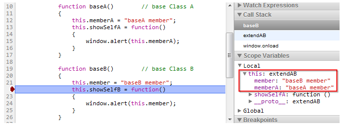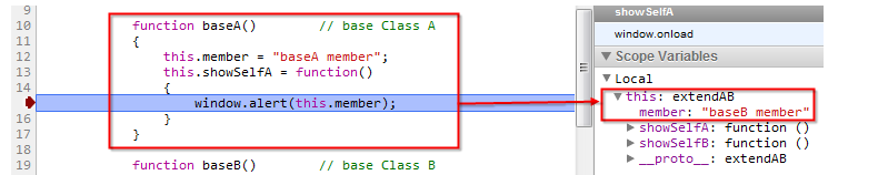 当调用extend.showSelfA();时,此时的this指向extendAB(并不是我们推测的两次都指向baseB对象)